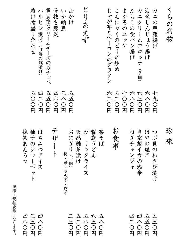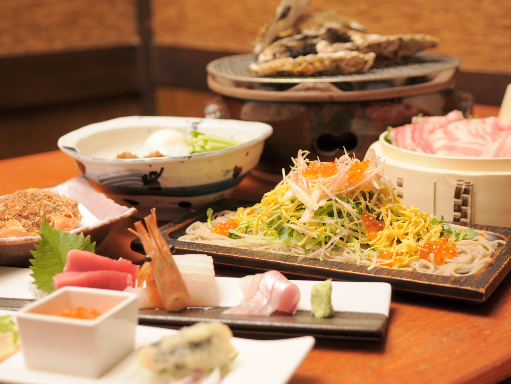 お通し、刺身、カキの浜焼き、カニの甲羅揚げ、新そばのサラダ、大崎産黒豚と冬野菜のせいろ蒸し、ジャージャーうどん